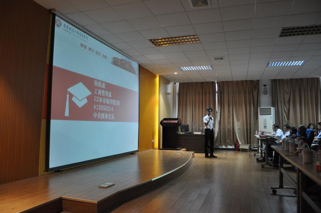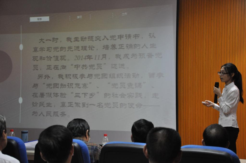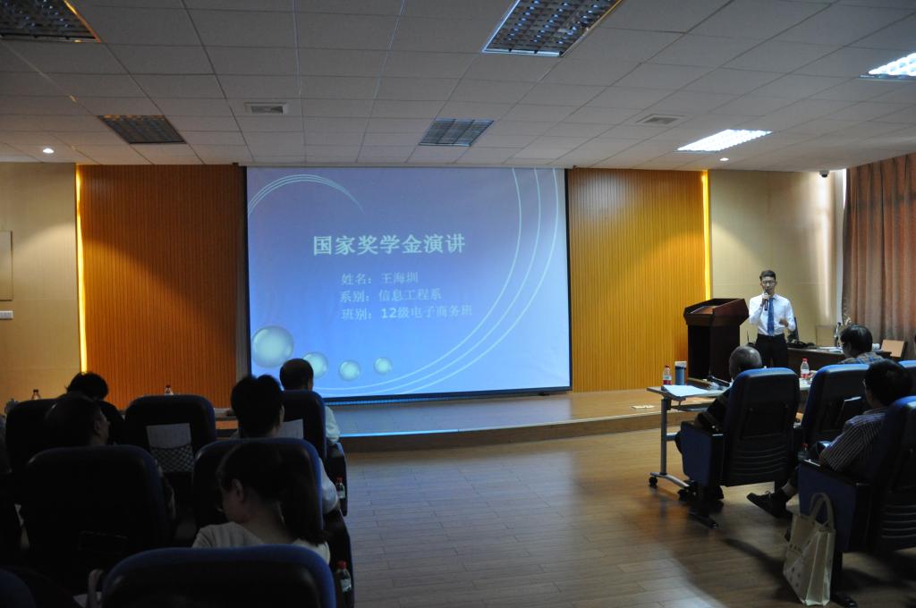 首先王锦秀副院长介绍2014-2015年国家奖学金总体评审情况;然后陈玉川院长强调国家奖学金获得者要具备优异的学习成绩,坚决拥护中国共产党,热爱社会主义祖国,并在关心集体、关心他人、热心公益事业方面有突出表现;随后是12名国家奖学金候选人通过PPT演讲方式汇报了自身的思想动向、学习成果、实践创新、自强不息、感恩回馈、热心公益等不同方面向大家讲述了各自的成长历程、感悟和收获。展示了我校学生勤奋学习、拼搏进取、志存高远、求实创新的优良作风和精神面貌。