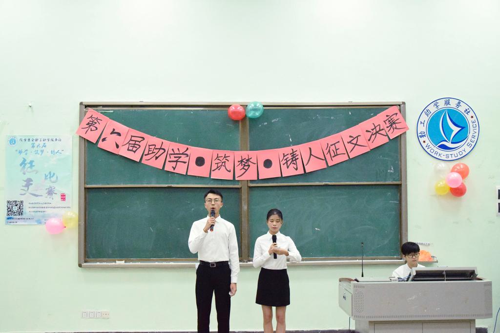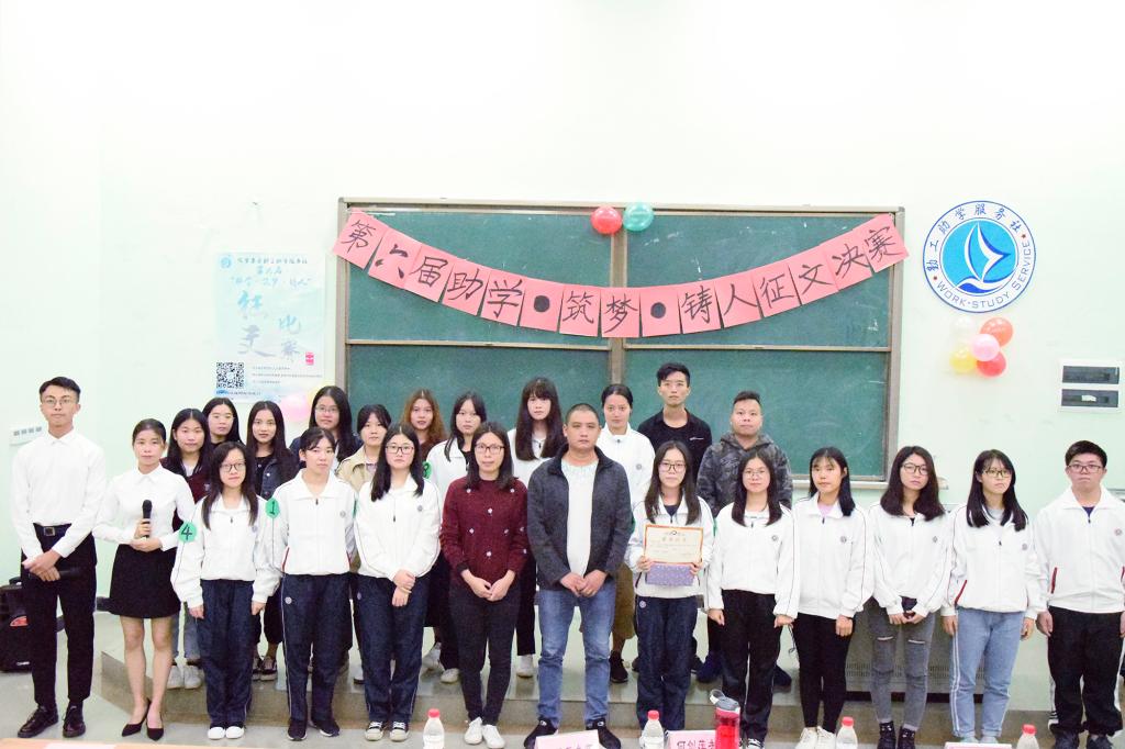 为完善我院资助体系,增强我院资助工作影响力,让学院学生更好地了解和参与勤工助学活动,加强对学生的励志感恩教育,并在学院树立榜样作用,院勤工助学服务社特于 2018年11月21日星期三19:00在励志楼D308举行第六届“助学·筑梦·铸人”征文比赛决赛。
