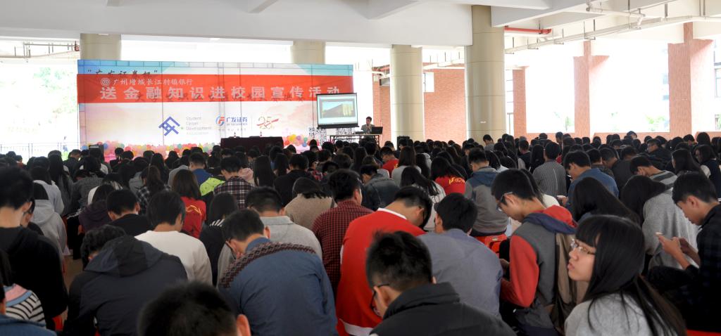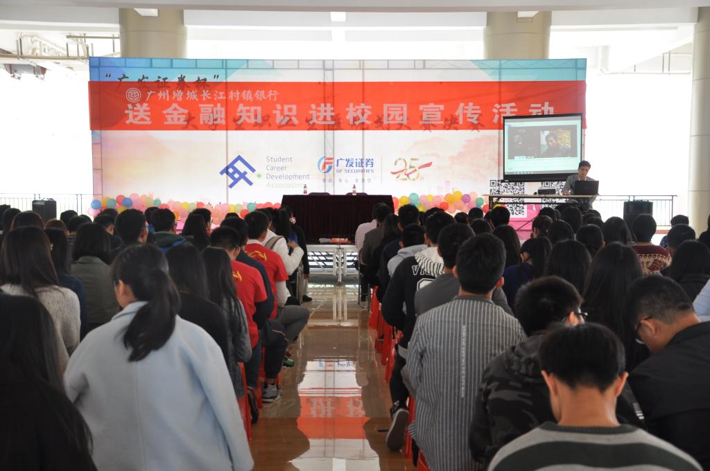 为进一步普及金融基础知识,增进大学生对现代金融产品的认知和了解,帮助大学生树立正确的金融消费观念,提高他们的金融理财和金融安全防范意识。2016年12月6日,学院学生处和广州增城长江村镇银行共同举办了“送金融知识进校园”活动,活动通过摆摊宣传及金融知识讲座的形式进行。参加讲座的有学院学生处处长李希恒、黄国富副处长以及各二级院系学工负责人、辅导员和学生处助学管理科、全校大一至大三班长300多人,还有长江村镇银行陈经理等。本次讲座也是“学生骨干思政培训班”003期内容。
