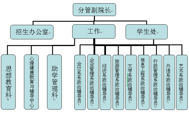 学院目前已基本形成学生工作由分管院长统一部署、学生处业务指导、各系政治辅导员具体实施、实行院系两级管理为基础的学生工作体系。坚持每周召开一次政治辅导员工作例会,交流情况,研究问题,部署工作。 分管副院长 工作 招生办公室 学生处
