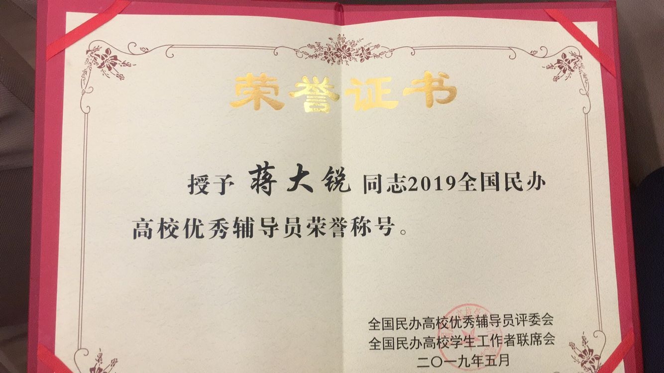 我校蒋大锐老师荣获“2019年全国民办高校优秀辅导员”称号