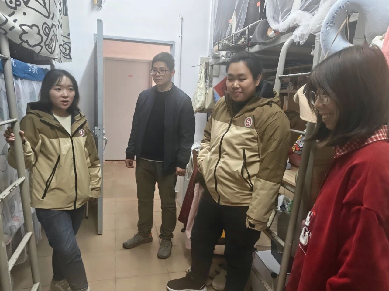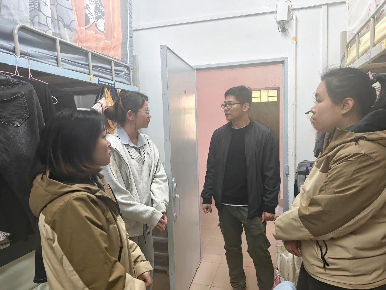 在走访过程中,段晓聪副处长和袁艺株、余杏老师深入学生生活空间,与同学们谈学业困惑、解生活难题,聊职业规划,重点了解宿舍设施、环境卫生、安全保障等实际问题。同时他们特别关注学生的学习进展,询问了课程学习中遇到的困难,并鼓励学生们积极面对挑战,利用学校提供的资源和平台,不断提升自我。