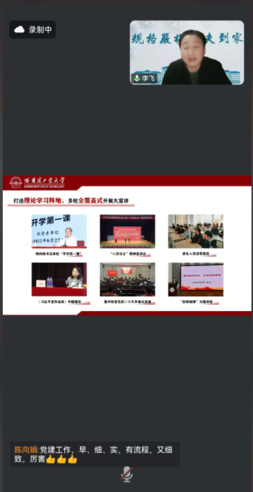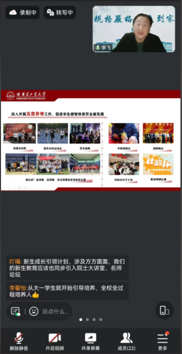 作为深耕辅导员岗位32年的资深教育工作者,李飞教授以"哈工大辅导员手册"为蓝本,结合自身实践经历,从四个维度展开分享。在腾讯会议界面中,其发言窗口背景"规格严格功夫到家"的横幅标语,恰如其分地诠释了高校辅导员工作的精神内核。