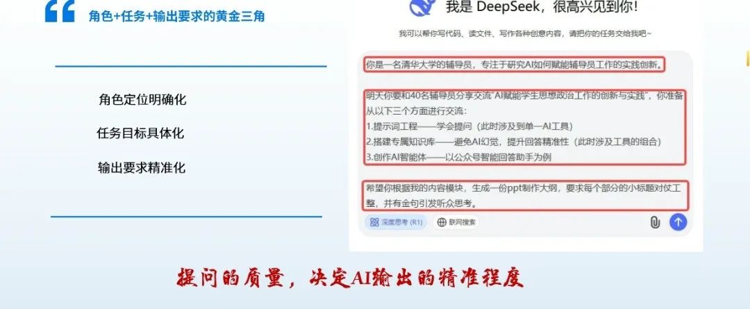 伍晓芸老师作为全国高校辅导员名师工作室主持人、四川省名辅导员工作室主持人,深耕AI育人实践,成果丰硕。她从“对话密码:提示词工程的结构升级”“数据筑基:专属知识库的精准回应”“智能延伸:AI智能体的快速搭建” 三大维度,系统拆解AI融入辅导员工作的底层逻辑与实操方法。