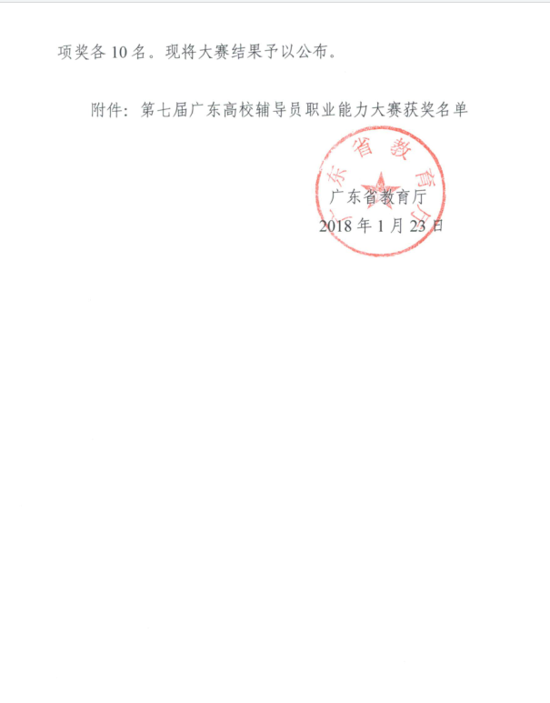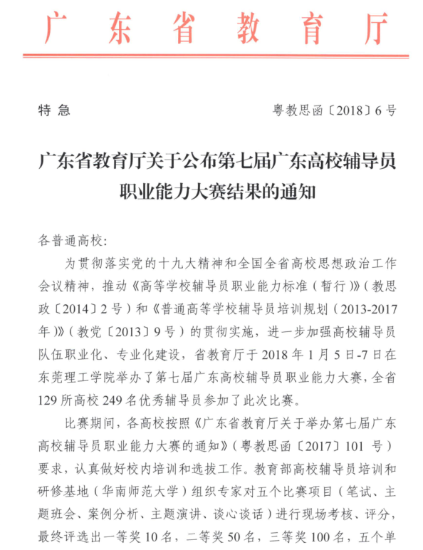 近日,广东省教育厅公布了第七届广东高校辅导员职业能力大赛的结果,我院文学院文学系王洁老师在本次大赛中从全省249名选手中脱颖而出,荣获三等奖的佳绩。