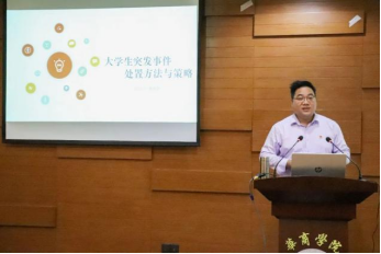 第一部分是黄国富副处长为辅导员讲解地震、消防、暴恐等项目避险和疏散知识培训会。首先黄国富副处长简述了大学生的突发事件,然后对突发事件应急处理进行了简单叙述并列举了相应的处理策略,最后对突发事件的案例进行了简要分析。