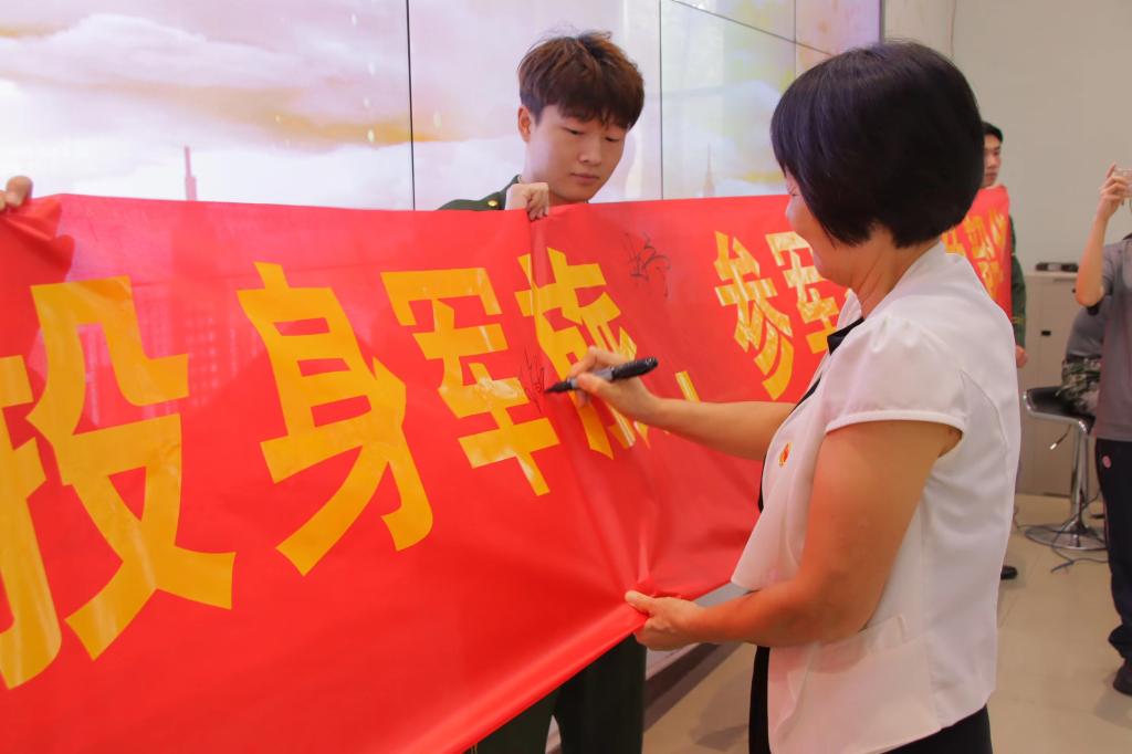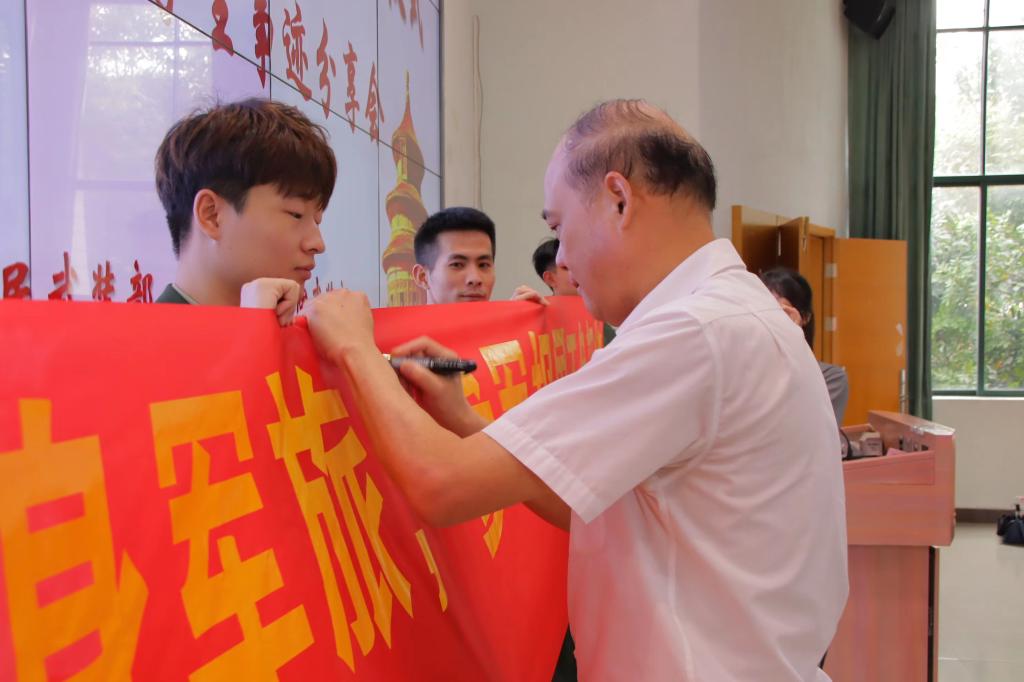 全体领导、教师和部分学生代表上台为下半年征兵报名作签名动员仪式。