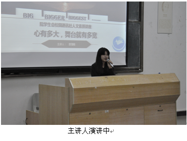 3月22日下午6时30分,由学生处指导,广东财经大学华商学院院学生会校园通讯社主办的第一期主题为“心有多宽,舞台就有多大”的人文素质讲座在励志楼B栋407室举行。主讲人是来自13级环境设计5班的曾惜敏。她是院优秀学生干部,在大一,大二连续两年获得院优秀生一等奖并荣获2014-2015年度国家奖学金。