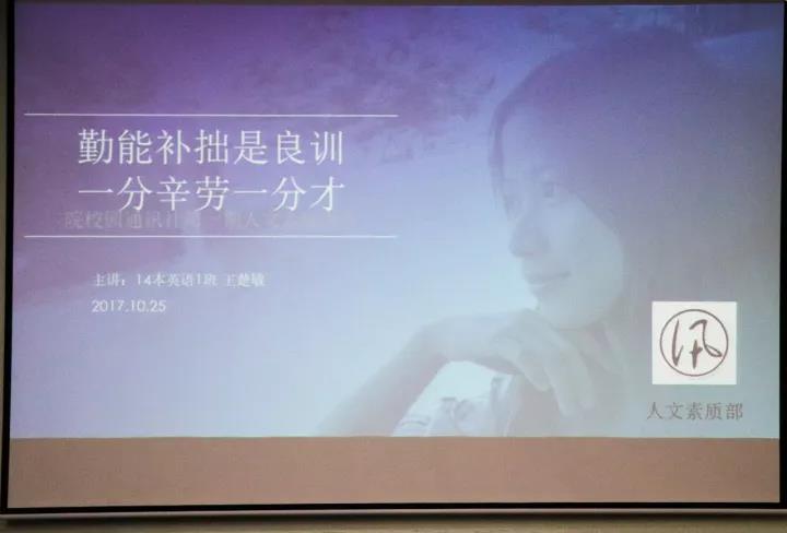 本次讲座的主题是“勤能补拙是良训,一分耕耘一分才”,主讲人是来自14本英语1班的王楚敏师姐,今年八月她代表学校参加了广东省“助梦扬帆”大学生海外研学项目,她勤奋学习,获得国家励志奖学金,校级优秀生二等奖,连续两年综合测评排名班级第一。