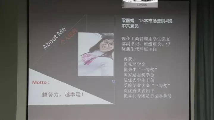 她随后也介绍了自己的大学生活,梁丽娟师姐在大学期间获得了学院创业大赛“三等奖”,优秀学生干部称号,校优秀生一等奖,国家励志奖学金,国家奖学金等等。在社团与校外实践中的经历也是多姿多彩:担任过学生会体育部部长,工商管理系学生党支部副书记,广州边际公司策划员等。