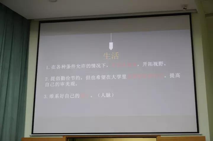 在生活篇师姐也罗列出三个部分,一是鼓励同学们多外出,可开拓视野,增长见识。二是要提高审美观,注重外在形象。三是寻找自己的生活圈子,定位好自己。在最后感悟篇里,梁丽娟师姐给我们播放了一个短视频,从而引出了她的感悟——不必在乎他人的眼光,要有勇气做自己想做的事情,追逐自己的梦想!