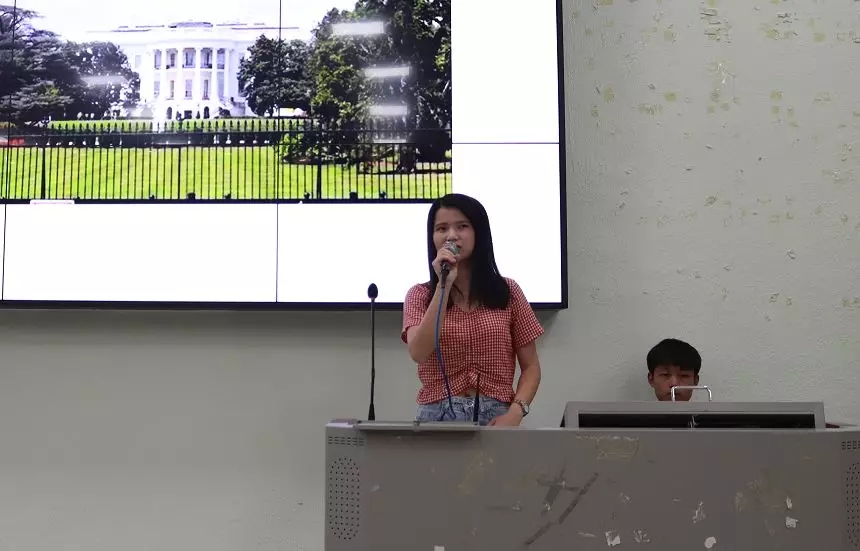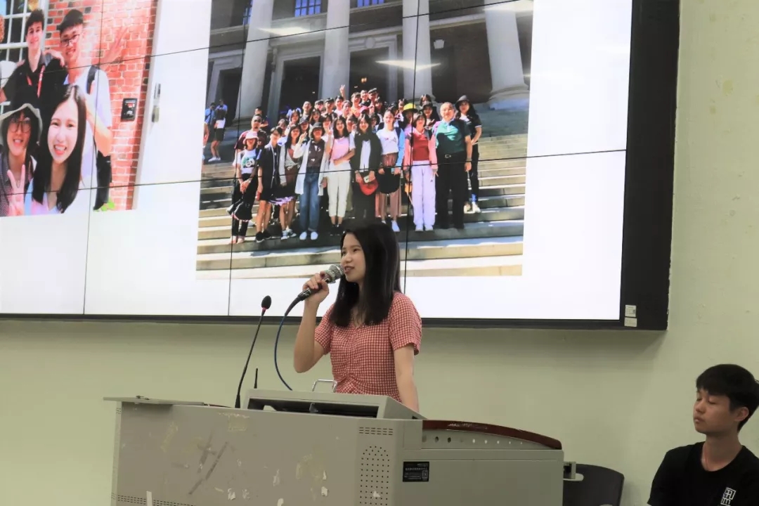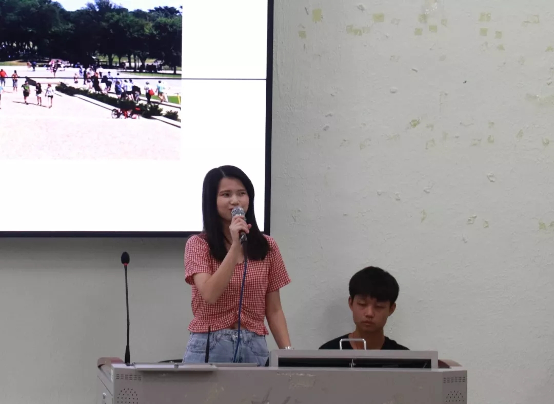 然后,陈丽敏师姐开始分享她在研学之旅过程中的趣事和感受。陈丽敏师姐在研学过程中,曾和小伙伴一起熬夜写策划书,在这过程中收获了友情;曾在国外教授的循循善诱下,从而直视自己一直在回避的问题;曾观摩耶鲁大学的图书馆;也曾和小伙伴一起在纽交所寻找中国的国旗,齐唱国歌。