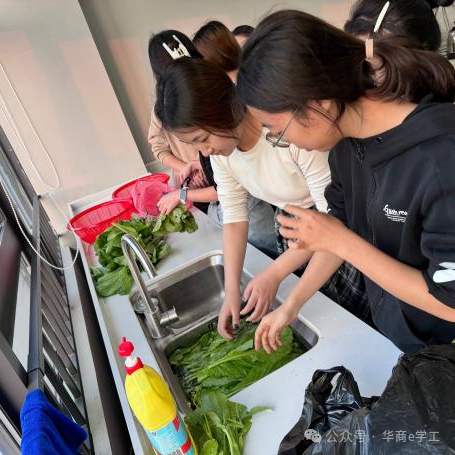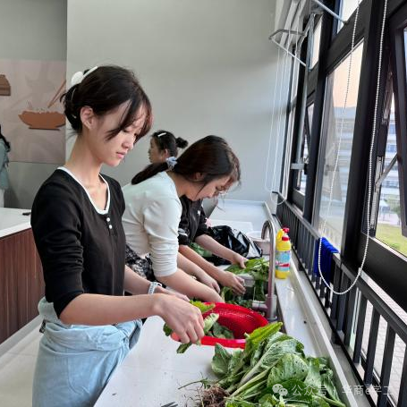 大家带着基地自产的新鲜青菜和购买的其他食材等,细致清洗、切碎备料;负责场地布置的同学快速清洗厨具,做好准备工作;负责后勤的同学清晰拆解流程、强调安全要点。分工明确的同学们各司其职,默契配合拉开活动序幕。
